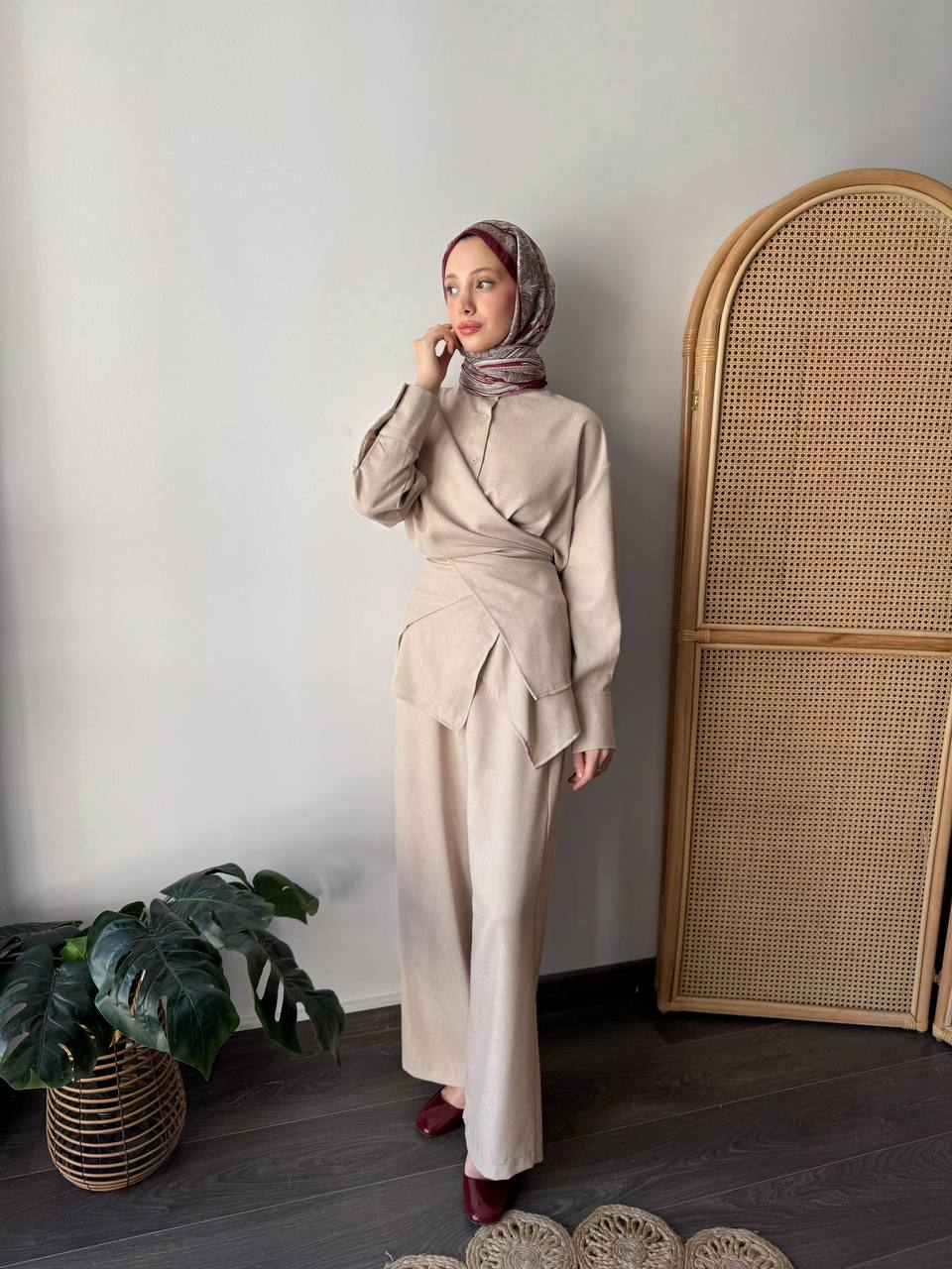 Ein moderner Zweiteiler, der Komfort und Stil harmonisch vereint. Das Oberteil mit elegantem Knotendetail in der Taille sorgt für eine schmeichelhafte Silhouette, während die weit geschnittene Hose für einen fließenden Fall und angenehmen Tragekomfort sorgt. Das Set eignet sich perfekt für entspannte Alltagslooks oder stilvolle Anlässe.