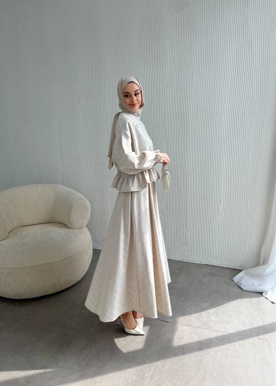 - Material: Der Rock besteht aus dem gleichen strukturierten Tweed wie das Oberteil, was für ein harmonisches Gesamtbild sorgt. Der Stoff ist warm und angenehm, perfekt für kühle Tage.